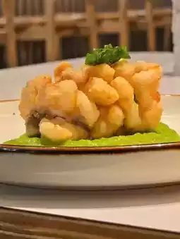 The method of Chinese and Western fusion to prepare eel, eel baked and then fried, crispy outside and tender inside, in the bottom of the basil green sauce taste very fresh, covered on the eel together to eat can reduce the greasiness.