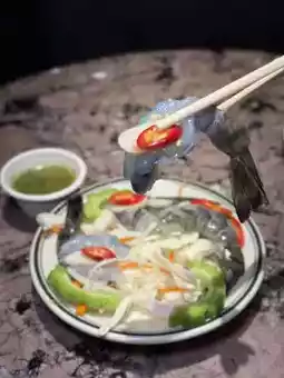 A plate of four large shrimp sashimi. The shrimp are large and thick๐ฆ with a crispy and chewy texture. Served with a spicy and sour Thai chili sauce, topped with garlic slices and chili peppers๐ถ