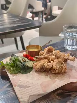 The drumsticks are fried to a crispy perfection, and the chicken is tender. It comes with a small Italian vinaigrette salad on the side.