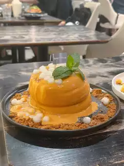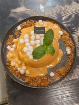 The two-layer pancakes are thick and fluffy with a rich egg flavor. Topped with indulgent Thai milk tea sauce, mochi balls, cookie crumbs, and more for a delightful texture.
