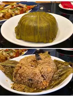 #Abalone and Scallop Lotus Leaf Rice: The giant lotus leaf rice is generously filled with bouncy Dalian abalone, scallops, shrimp, lean meat, and more. The rice is fragrant with lotus leaves, yet not too soggy. What a surprise!
