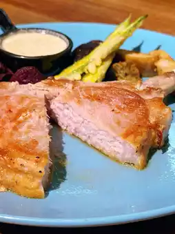 The Canadian pork loin is tender and juicy, complemented by a slightly spicy mustard seed sauce with a grainy texture. The flavors are refreshing and layered.