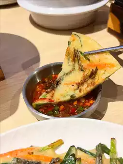 The pancake is filled with leeks, shredded carrots, and chili peppers, pan-fried to a crispy aroma. Dipping it in the flavorful sauce makes it even more delicious😋