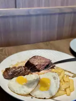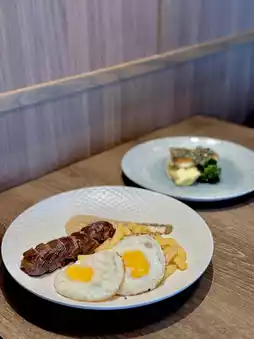 The main course chose halibut, fried to crispy skin and tender meat, with lemon butter sauce, fresh and not greasy ~ 🥩 Steak & Eggs with Fries, steak ordered medium, rich in juice, sun egg melted with french fries super satisfying!
