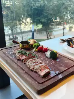 Grilled U.S. Grain-fed Flank Steak (12oz) with Seasonal Vegetables 🥩: The flank steak is grilled to a slightly charred exterior and tender pink interior 😍. It has a rich beef flavor, a chewy texture 😆, and is incredibly juicy 😋. Adding the sauce gives it a different taste 👍🏻. On the side, there are roasted garlic 🧄, broccoli, tomatoes 🍅, eggplant 🍆, and baby corn 🌽.