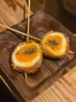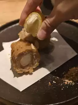 From the various kushiage options, I chose two. Both dishes were fried to a crispy finish. The sesame tofu was tender and soft. The egg in the pork and egg roll was runny, and the yolk flowed all over your mouth.