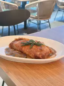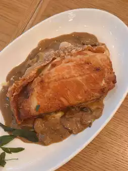 Italian Porchetta ๐: The Italian roasted pork belly is incredibly thick ๐ฑ, with a crispy skin ๐. However, the meat is slightly too salty and tough ๐ฅบ. It is served on a bed of mashed potatoes and black mushroom sauce ๐ฅ๐๐ซ.