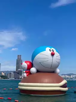 - Victoria Harbor's first super giant cartoon character sea parade: Doraemon, LABUBU, KAWS, Sesame Street Elmo, Smooth Dudu and others float on the sea, the background with Hong Kong high-rise buildings + blue sky and white clouds, the picture is super fantastic!