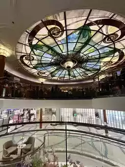 The cruise atrium features a Tiffany glass-topped high-pitched atrium✨, a 180-degree floor-to-ceiling glass panoramic bar🍸 and a promenade🌊 on the 7th floor.