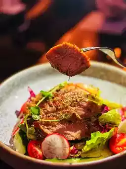 This salad features roasted beef paired with a refreshing salad, dressed with a Japanese yuzu vinegar-based oil and vinegar mustard dressing, enhanced with green wasabi and a touch of sugar. The result is a refreshing, appetizing dish with a hint of wasabi kick.