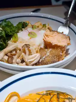The salmon is fried very fragrant, the crust is crispy and the meat is firm🐟 Side dishes include kale/yuko tofu and mushroom rice. The seasoning is Meijen plum and a hot spring egg can be mixed with the rice to eat together. It is moist and does not affect the taste of the rice🥄