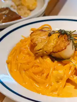 First came to eat a piece of seaweed is quite fresh and sweet 😆 The shrimp is not big but the doneness is just right tender ~ pasta soft and hard moderate sauce is also very Creamy in the middle also mixed with some crab meat to improve the freshness