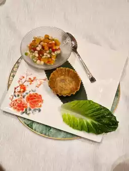 #Purple sweet potato ham with honey: This taro purple is gorgeous! The purple sweet potato gua bao (a type of steamed bun) features a unique diamond pattern, resembling a handbag. It's served with freshly baked crispy tofu skin, rich in bean flavor, Yunnan Xuanwei ham, and osmanthus honey. Enjoying it all together creates a delightful combination of soft, crispy, savory, and sweet flavors.