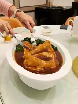 #Braised Whole Six-Head Fish Maw in Abalone Sauce: These are very large pieces, enough for seven people. The abalone sauce is rich and flavorful, with just the right consistency. The fish maw is tender and slightly sticky – a must-order for banquets.