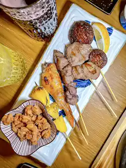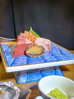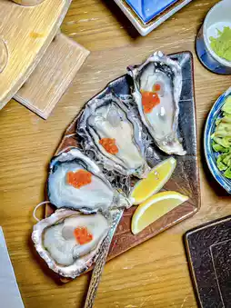 The meal starts with a Japanese-style salad and a five-color sashimi sea urchin cone, filled with sea urchin, tuna, yellowtail, salmon, and minced tuna in a crispy cone. The sashimi is so smooth and fresh, it feels like eating savory ice cream. Next, you can choose one of three appetizers: a mixed sashimi platter with fresh salmon, yellowtail, tuna, sea bream, and abalone; four creamy and sweet fresh oysters from Hyogo Prefecture, Japan; or a selection of six skewers, including chicken cartilage, caramelized pineapple, chicken wings, tender A4 Wagyu beef, shiitake mushrooms, and thick-cut beef tongue, all freshly grilled by the chef.