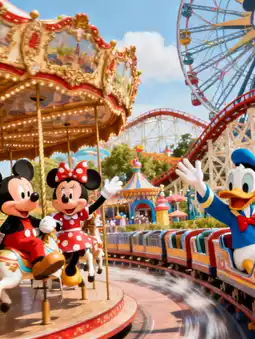 1. Castle of Magical Dreams at Sunset – The iconic castle glowing in golden hues, with Disney characters waving from the balcony and confetti drifting through the air.