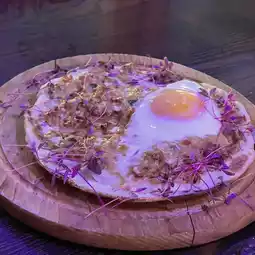 Like Pizza but the substance is not, is with rice milk with chicken minced onion, parsley, ginger garlic sauce, green chili, egg fried, the taste is like a thinner egg cake, the cake edge crispy, rich filling flavor, plus the top of the edible flowers, the first time to eat quite interesting