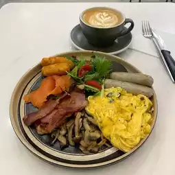 French fries, bacon, smoked salmon, sausage, mushrooms, black truffle scrambled eggs, salad