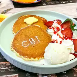 Strawberry Pancake from C0T. The fluffy pancake with fresh strawberries🍓 is a completely pleasing dessert😘