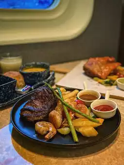 The steak is grilled to medium rare, tender and juicy; the shrimp is fried until just cooked, the taste is refreshing; the scallops are lightly fried until the outer layer is browned, with a little sashimi texture😌