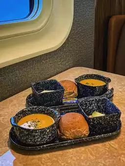 Selling similar to airplane meal presentation, pumpkin soup taste creamy, fruit has honeydew melon and cantaloupe, taste sweet 😌