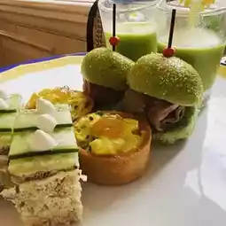 🥪 Selected finger sandwiches Traditional cucumber sandwich Green bean frozen soup, smoked salmon, salmon coronation chicken tart, mango sweet and sour sauce grilled beef bun, pickled cucumber, horseradish cream, spicy mustard