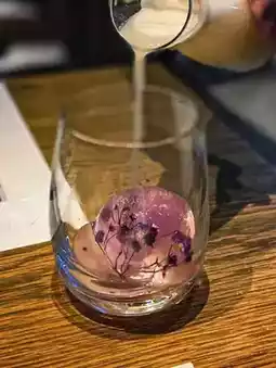 The round ice cubes have purple edible flowers inside, the color is fantastic😍 Pour the cocktail into a cup, the ice cubes melt to reveal the edible flowers, drink more rich litchi flavor, indeed quite special😌