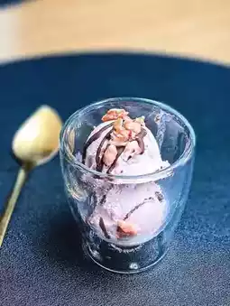 Red bean ice cream with chocolate sauce, with red beans, taste not too sweet, good😌