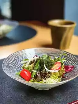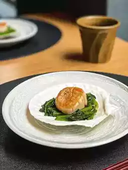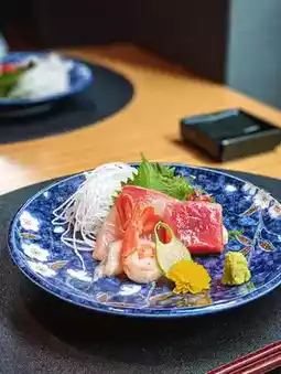 The three sashimi are very fresh, including red shrimp, red shrimp and oily fish, thick cut makes the taste excellent 😋 accompanied by a piece of lotus root, the taste is crisp and fresh. You can also add a small amount of petals to the sauce to give the sauce a light floral aroma.