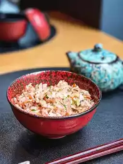 There are two ways to eat fried rice, first, taste directly, the taste has a little plum sour and fragrant cherry shrimp flavor; then poured the salmon soup, the sourness immediately geometrically improved, become greasy tea stain rice 😌
