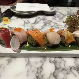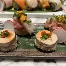 The rainbow sushi roll is made of six different colors of seafood, including red snapper, sea bream, salmon, scallop, ark shell and pond fish. The taste, intensity and texture are all unique, but the common point is that they are fresh 🥳