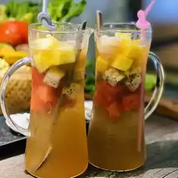 Be sure to drink, large cups, peach tea is sweet and clear, and lots of fruit