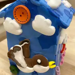 The piggy bank is coated with white glue on each side of the house and roof, pasted with different colors of clay 🔴🟣🔵🟢🟡🟠, then the small decorations are slowly pasted on each piece, and finally add some clay decorations, and you're done 🤩🤩🤩