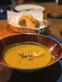 The pumpkin cream soup is golden yellow, the pumpkin flavor is sweet and rich, the taste is very thick and creamy, with bread is indeed good😌