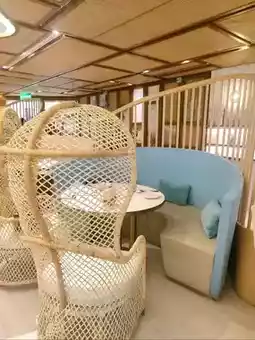 Environment: The window frames of the restaurant facing the sea are curved, and diners sitting by the windows can enjoy the beautiful view of Victoria Harbour. Unfortunately, my good sister and I didn't have any connections to reserve a table, so we were arranged to sit in another gray-blue booth with a Thai-made peacock rattan chair at the check-in area. It was very comfortable to sit on. There was also a rattan swing that was specially designed for checking in at the store. On that day, men, women, young and old also sat on the swing to take photos.