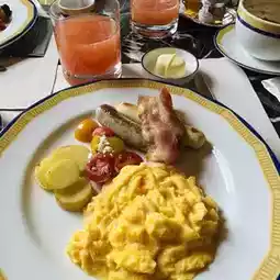-Fried or scrambled eggs with bacon, chicken and beef sausage or French toast with apples, mixed berries and maple syrup