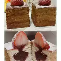 Square shape, top with grass new strawberries, cut the middle has a big piece of strawberry sauce, my mother said it was very tasty😂