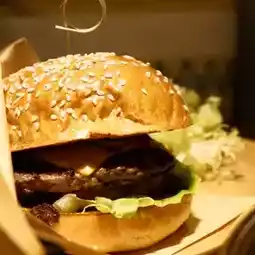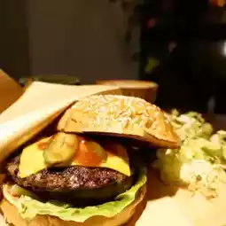The bread is spread with butter and baked dry, and the hamburger patty is of medium thickness. When cut, you can see the pink degree of doneness. The meat is a bit chewy and has a solid texture with a strong beef flavor. It is paired with other fillings such as cheese, tomatoes and lettuce to present a classic taste. There are also salad 🥗 and French fries 🍟 as side dishes, which are enough to fill you up.