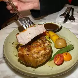 My friends and I like it very much. It is slow-cooked. The super thick pork saddle is tender and juicy