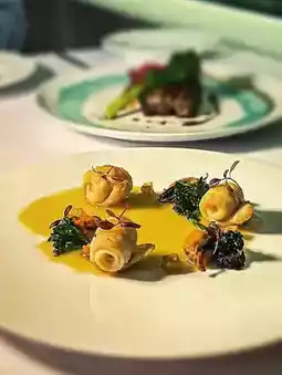 mozzarella cheese is then baked until browned, mussel powder with fresh handmade pasta al dente, cheese with scallops and lobster is very delicious😌