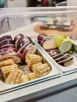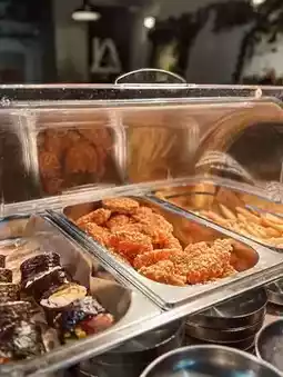 The restaurant also has a salad bar in the atrium, featuring vegetables like eggplant and cucumber, as well as prepared dishes like seaweed rice rolls and fries, making for a pretty diverse menu.