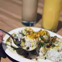Fried round crispy puffs, still remain crispy, with chickpeas, curry, mint, sweet sour beans, drizzled with spiced yogurt, very rich, and like the rich flavor of yogurt sauce, surrounded by crispy puffs, with the taste of coriander