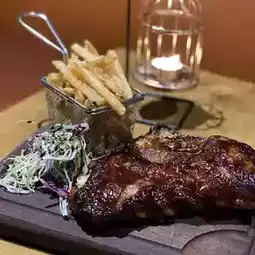 American grilled Spanish black hair pork ribs, using black hair pork is particularly hearty, BBQ sauce is very flavorful, the meat is baked very soft and slightly refreshing, good, beer crispy fries, especially crispy, and fresh salad vegetables neutralize the greasiness