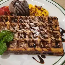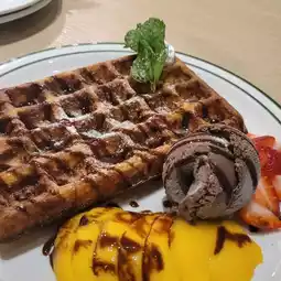 * Fresh mango strawberry waffle crust a little crispy, inside so soft and egg flavor with cream and chocolate ice cream is very good. Fold with mango and strawberry to refresh and another kind of deliciousness. My daughter ate lam lam tongue!