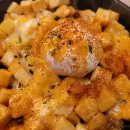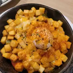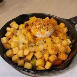 * Cajun chicken potato chips pan, with a melted boiled egg on top plus full cheese and cajun powder sandwiched with crispy potato chips and chicken, delicious!