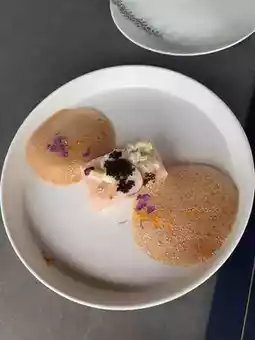 Appetizer - Liu Fu Shan Fresh Prawn Smoothie with Pickled Pineapple Salsa. Sweet and sour bubbles, the waiter recommended this, said it was made with local ingredients to make this dish, so I tried it. I initially imagined it was Thai shrimp cake, but when I served it, I knew I was wrong.