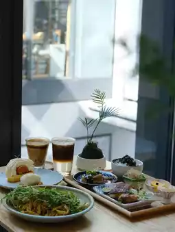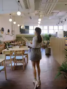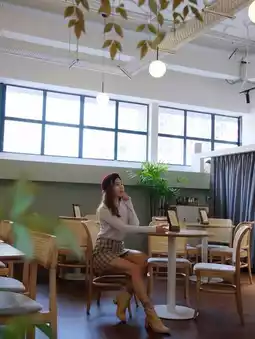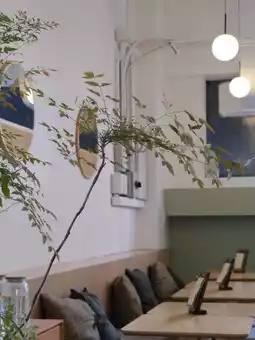 KoBaNe こばね means small feathers, simple and surprising playfulness brought to different areas ✨ The shop has a simple wooden table and chairs 🪑 next to a green potted plant 🪴 landing large glass location to come in advance ~ comfortable environment and large sense of space ~