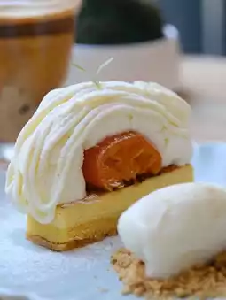 A great dessert for taking pictures, the surface cream is very light, the middle is wrapped with mandarin oranges, when cut, the mandarin oranges squeeze out the mandarin juice taste fresh and sweet🤩 The cheese tart at the bottom, with a thin layer of caramel, will not feel greasy after eating ~ with grapefruit sorbet taste very fresh, the bottom is also crispy together to eat