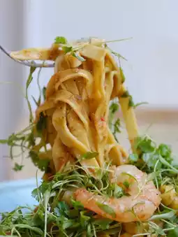 Coriander sprouts are full spread on the pasta very fresh🌱 in the middle in the bouncy bite of meat prawns🍤 Handmade pasta in the spaghetti, refreshing and tough with Al Dente taste🤩 Very juicy sauce with a little spicy, to pay attention to this ~
