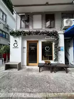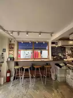 The shop has a pure white facade with wooden door frames, giving it a simple hipster feel. There are bar tables and regular seating in the shop.